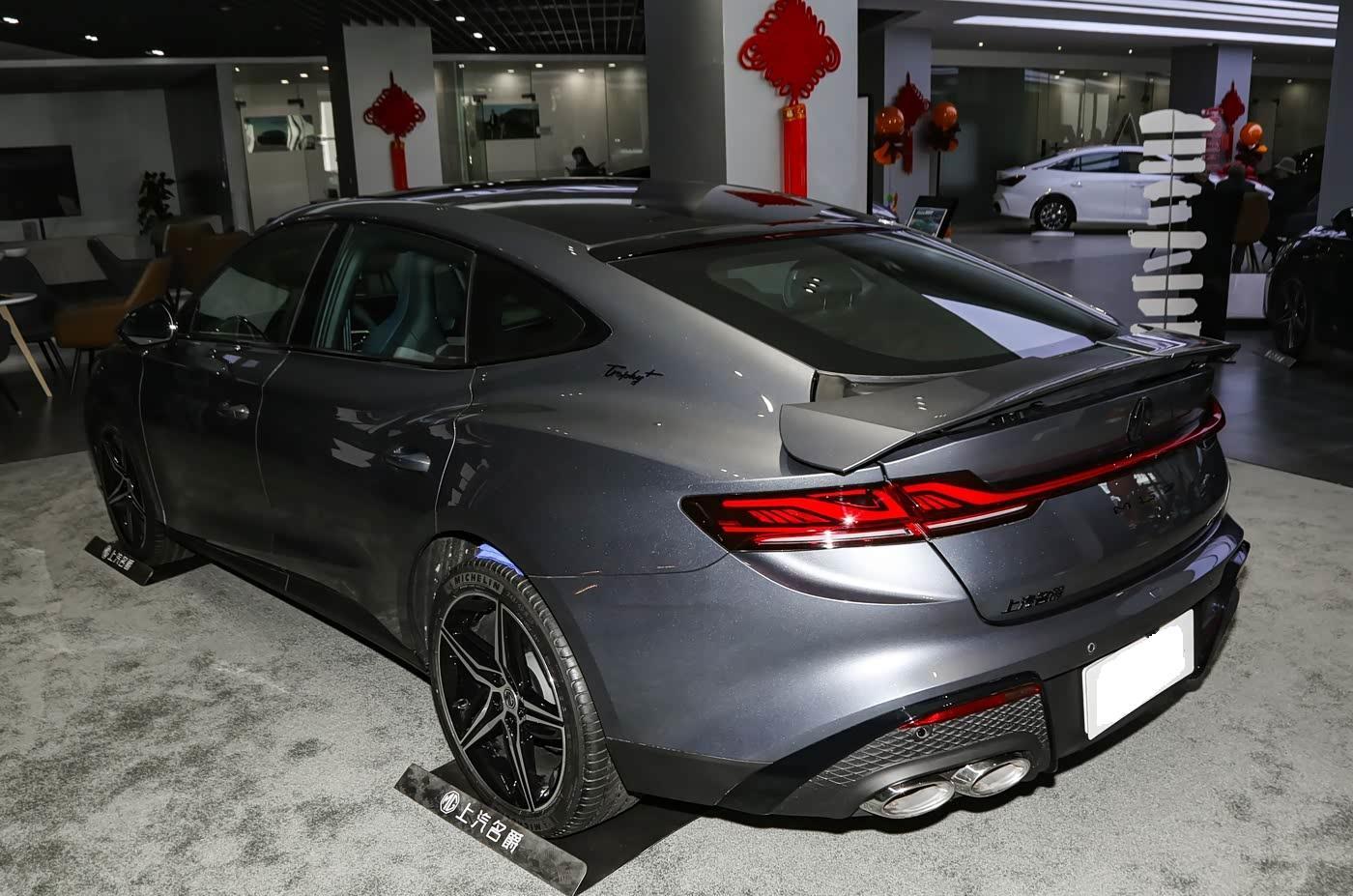 再来看车尾部分,车尾采用贯穿式箭翎尾灯,熏黑的配色结合内部精致的光源,夜晚点亮后的辨识度很出色,而且很多棱角线条的装饰还让车尾看起来更加厚重,配合自适应三段式电动尾翼(车速>100km/h自动开启),下方真双边四出排气可随驾驶模式切换声浪。后备厢采用掀背式设计,开口高度达1.2米,兼顾造型实用性与装载便利性。
