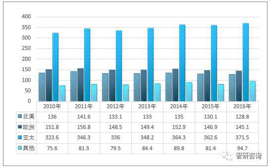 2010-2016年全球水泵市場區域分布(億美元)